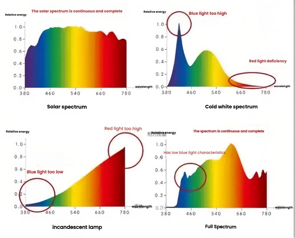 Some lamps have incomplete spectrum and excessive blue light. Staying under this kind of light for a long time will cause dry and swollen eyes, and will also interfere with the biological clock and make it difficult to sleep at night. Moreover, the lamp with a missing spectrum has a poor color rendering effect, and the colors of clothes and paintings are distorted.