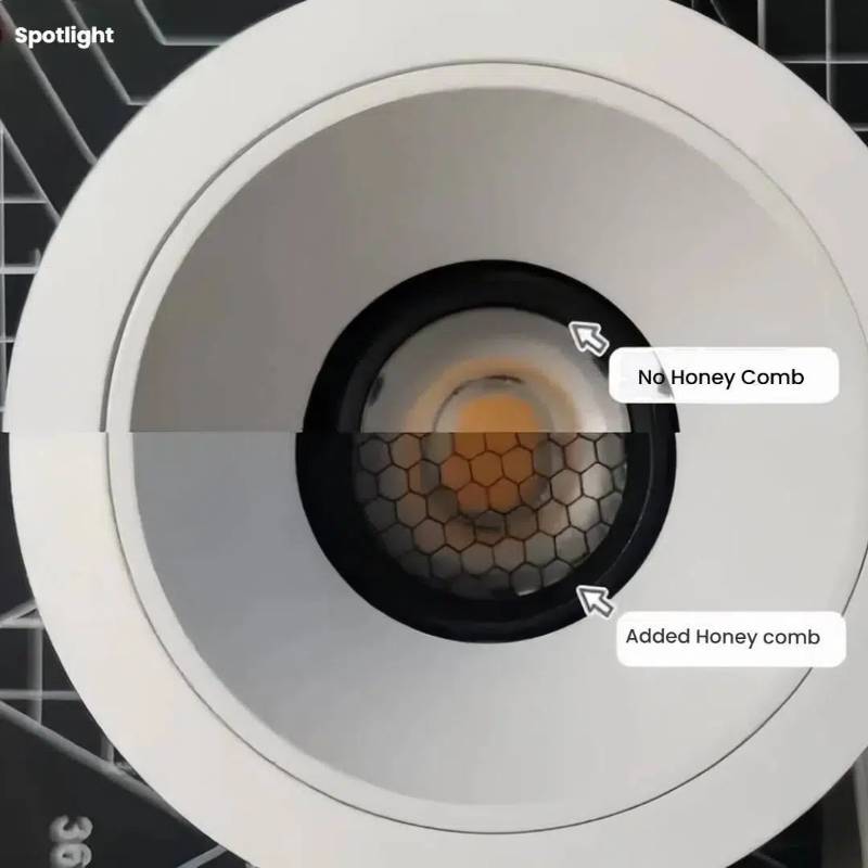 (2) Honeycomb mesh anti-glare: Adding honeycomb mesh to spotlights is also an effective method for reducing glare. The main principle is to change the light from direct light to indirect light, so that the residual light is reflected through the side of the honeycomb mesh to avoid stray light from reflecting from all directions.
