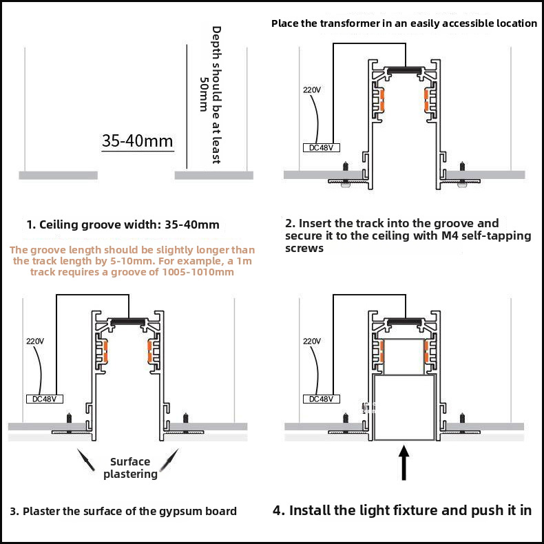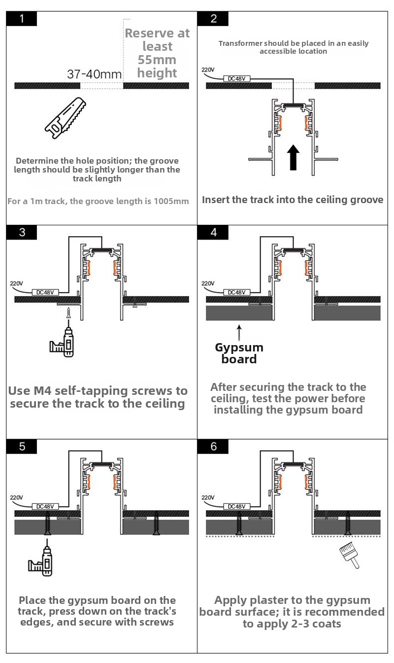 ① First, determine the installation location of the track light and mark it according to the track light's length.② Cut grooves in the marked locations (the transformer is installed near the access panel).③ Fix the track to the ceiling using self-tapping screws.④ Test the power supply to ensure the track installation is standard.⑤ Cover the track edges with plasterboard.