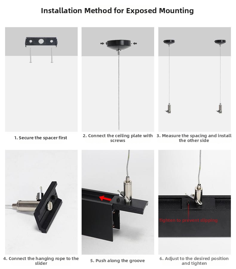 ① Fix the base pads (pay attention to the ceiling's load-bearing capacity and tightness).② Connect the ceiling plate with screws.③ Install the other ceiling plate (pay attention to the distance between the two ceiling plates).④ Connect the suspension rope and slider.⑤ Push the slider along the slot.⑥ Adjust the position and tighten.⑦ Connect the power cord (the transformer is installed near the access panel).