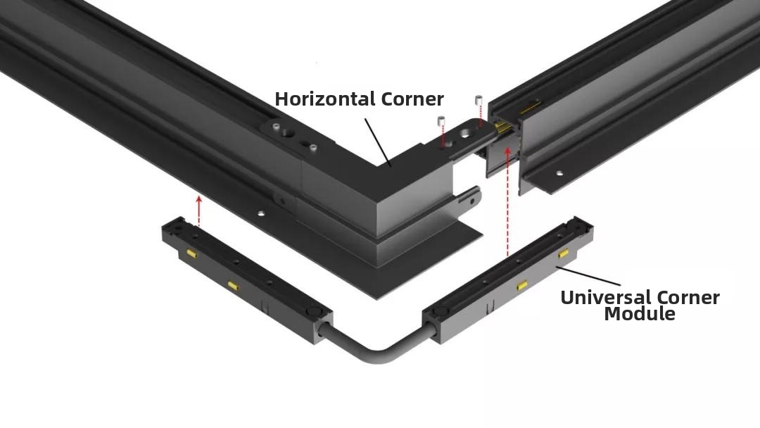 Horizontal Corner/Universal Corner Module: Connect and secure the two tracks using a horizontal corner bracket, then install the universal corner module to complete the circuit connection.