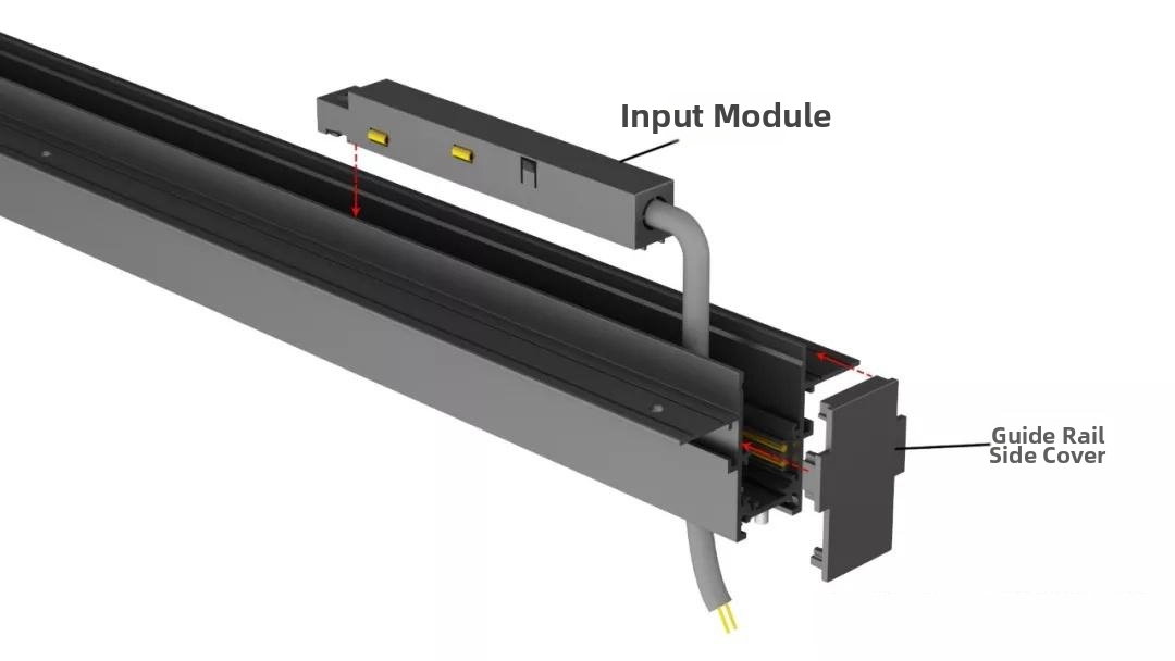 Input Module: At the end of the entire magnetic track, install the guide rail side cover, then install the power input module to connect the power supply.