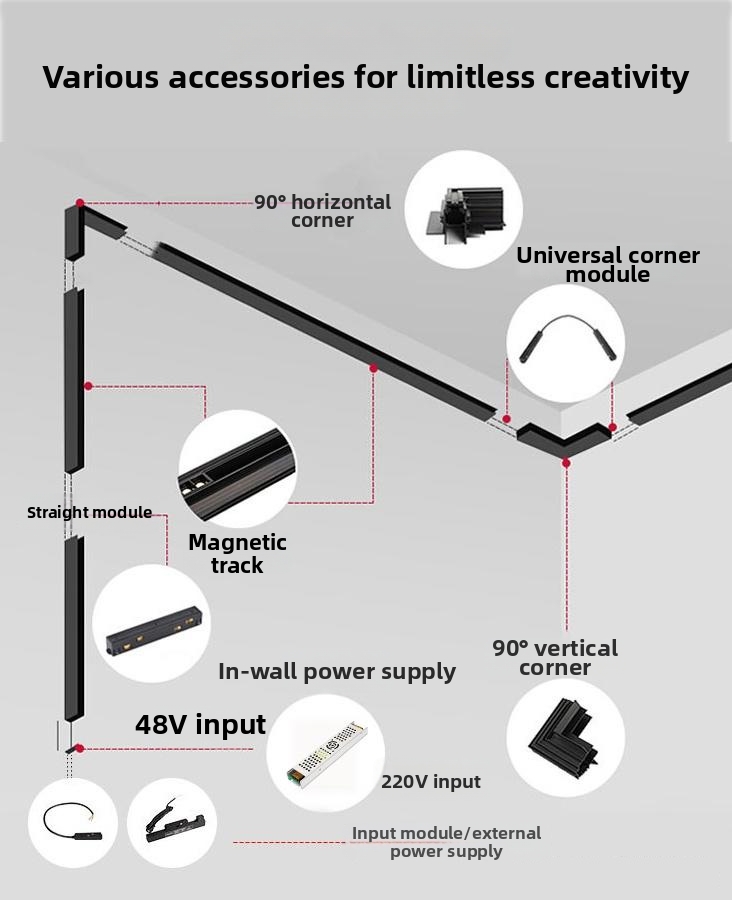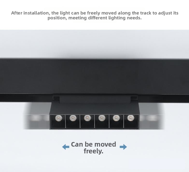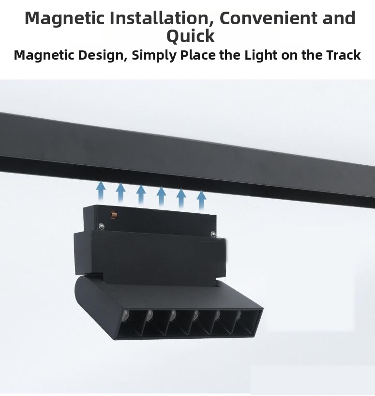 - Power Matching: Strictly control the total power of the lighting fixtures, not exceeding 80% of the driver's rated power to avoid overload and driver damage; when splicing multiple track sections, match the corresponding driver power according to the total length.- Circuit Safety: Low-voltage magnetic tracks require a dedicated DC48V driver; direct connection to 220V mains power is prohibited; when wiring, be sure to distinguish between positive and negative terminals, and ensure the interfaces are securely sealed to prevent leakage.- Splicing Specifications: When splicing multiple track sections, always connect the power pins first to ensure circuit continuity before mechanically fixing the splice to avoid "power interruption points"; after splicing, check the track flatness to ensure the light fixtures are firmly attached.- Moisture and dust protection: Magnetic tracks are suitable for indoor installation. Avoid installation in damp environments (such as bathrooms and kitchens). During installation and renovation, take precautions to prevent dust and moisture from entering the track and contaminating its conductivity.- Dimming compatibility: For dimming functionality, choose a dimmer compatible with the track drive (such as a Triac or 1-10V dimmer). It is recommended to test compatibility beforehand to avoid flickering, dimming, malfunctions, and other issues.- Post-installation maintenance: Ensure sufficient space is available for maintenance at the drive installation location. If dust is present on the track surface, wipe it clean with a dry cloth. Avoid contact with conductive parts with a damp cloth. When replacing light fixtures, attach or remove the light; disassembly of the track is unnecessary.