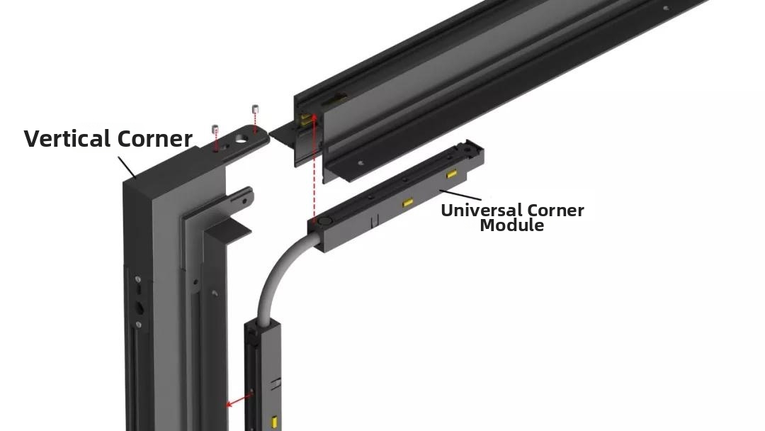 Vertical Corner/Universal Corner Module: Connect and secure the two tracks using a vertical corner bracket, then install the universal corner module to complete the circuit connection.