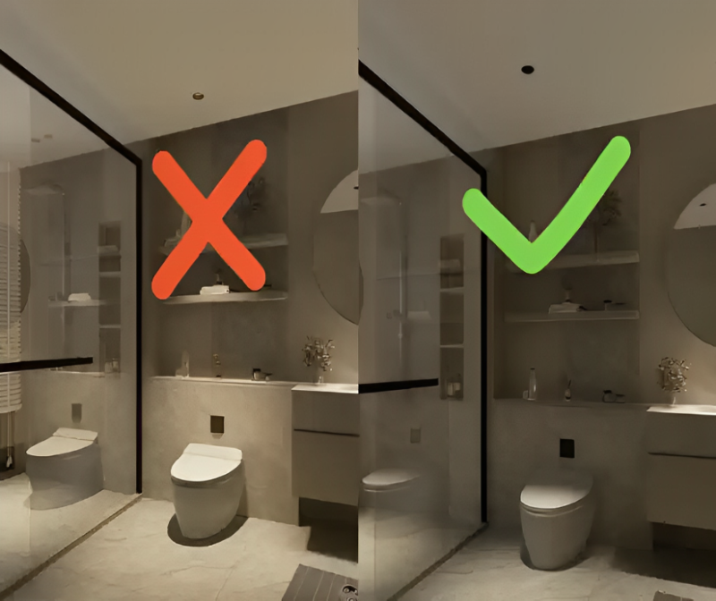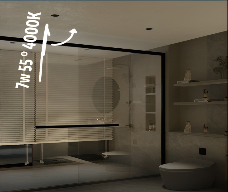The correct way to arrange the lights is to install an anti-glare spotlight (anti-glare value UGR<10) about 20-30cm in front of the toilet. Choose a waterproof LED Downlight with a large beam angle of more than 36°, which is sufficient and uniform.