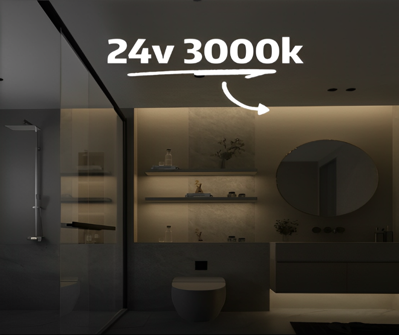 The voltage of the strip light can be 12V or 24V, which is considered a low voltage. The color temperature is 3000K, which looks warm and comfortable.