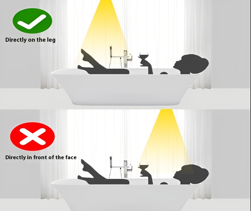 If you use a bathtub in your bathroom, and the bath time is longer than the shower time. Do not shine the spotlight on your head for an extended period, as this can make you feel uncomfortable and cause reflections when using your phone. Key points for bathtub lighting installation: