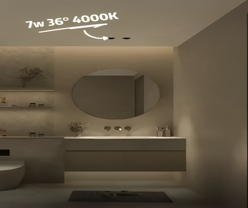 Basic lighting simply meets daily lighting needs. As long as it can illuminate the bathroom, it is fine. Generally, suitable downlights are selected and installed in the center of the bathroom. It is recommended to choose waterproof spotlights with a large beam angle of more than 50°. The color temperature is selected according to personal preference. Additionally, the power is selected based on the area and the number of lamps. Generally, 7W or 9W is more commonly used.