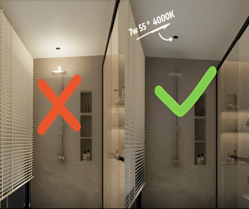 It is recommended to install waterproof downlights with a beam angle of 55° (UGR < 10) and position them 20-30 cm in front of the shower to illuminate the entire shower area. No matter which side you look at, the light is very comfortable.